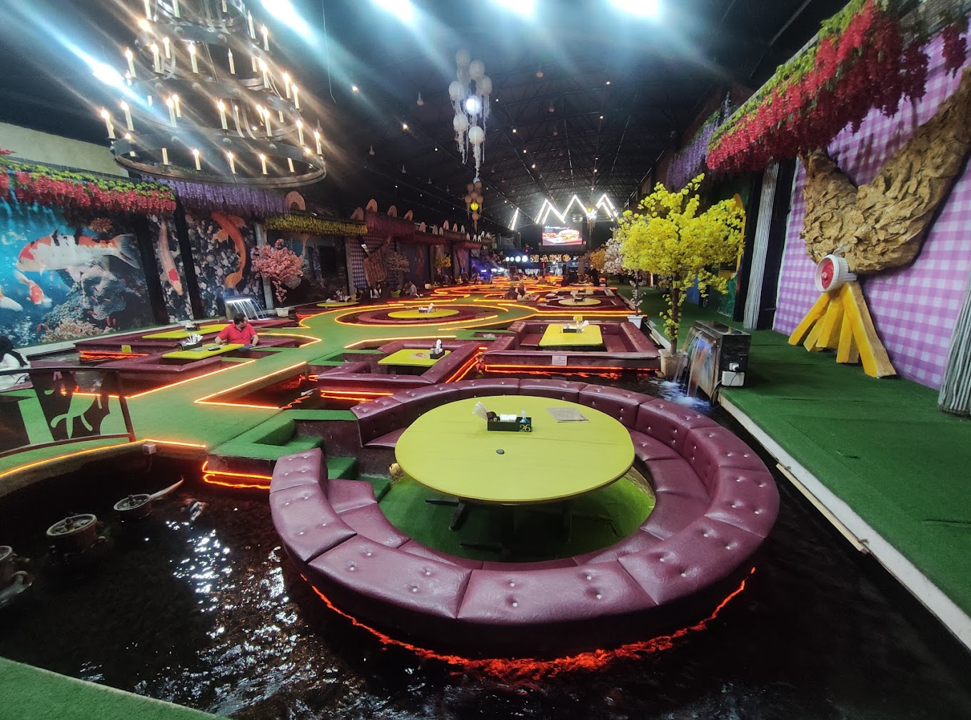 رستوران ماهیگ رشت دارای سالنی به وسعت 3000 متر مربع است که می‌تواند همزمان از 350 نفر پذیرایی کند. میزهای این رستوران، که ظرفیت آن‌ها از دو تا 30 نفر متغیر است، در عمق 80 سانتی‌متری آب قرار دارند. طراحی خلاقانه این فضا به شما امکان می‌دهد در حین صرف غذا، از نزدیک شاهد حرکت ماهی‌های زیبای کوی باشید، با لمس آن‌ها حس آرامش را تجربه کنید و حتی به آن‌ها غذا بدهید.