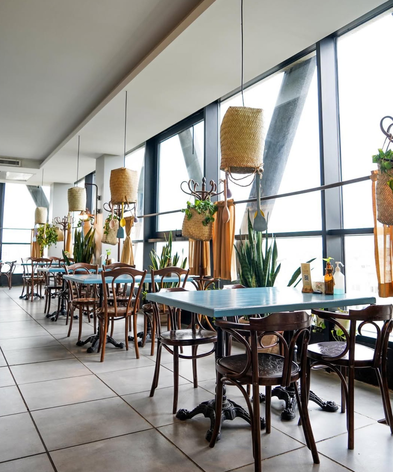 این کافه در دیزاین خود از المان های چوبی، رنگ های زیبا و تاب های آویزان از سقف استفاده کرده است.